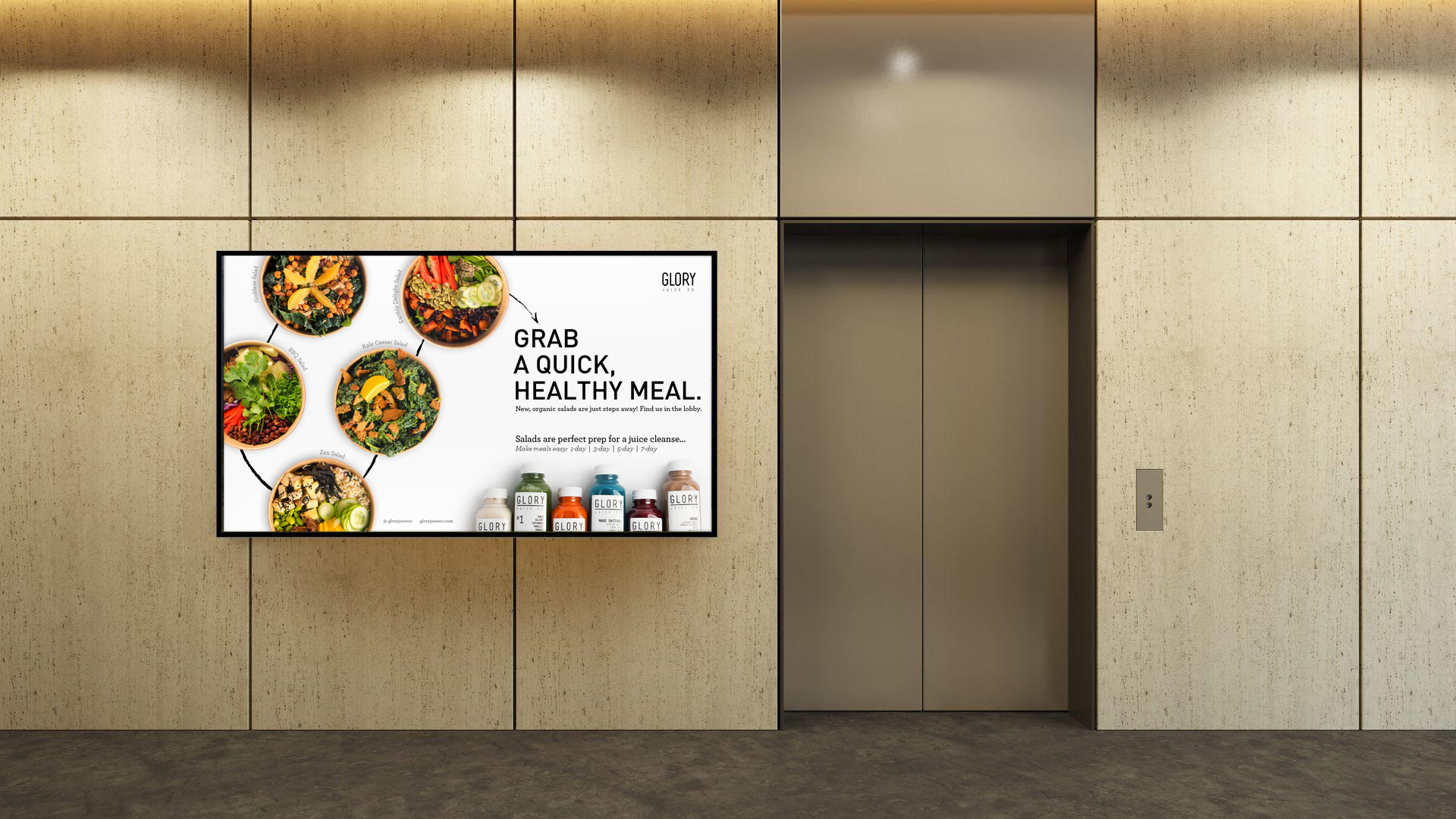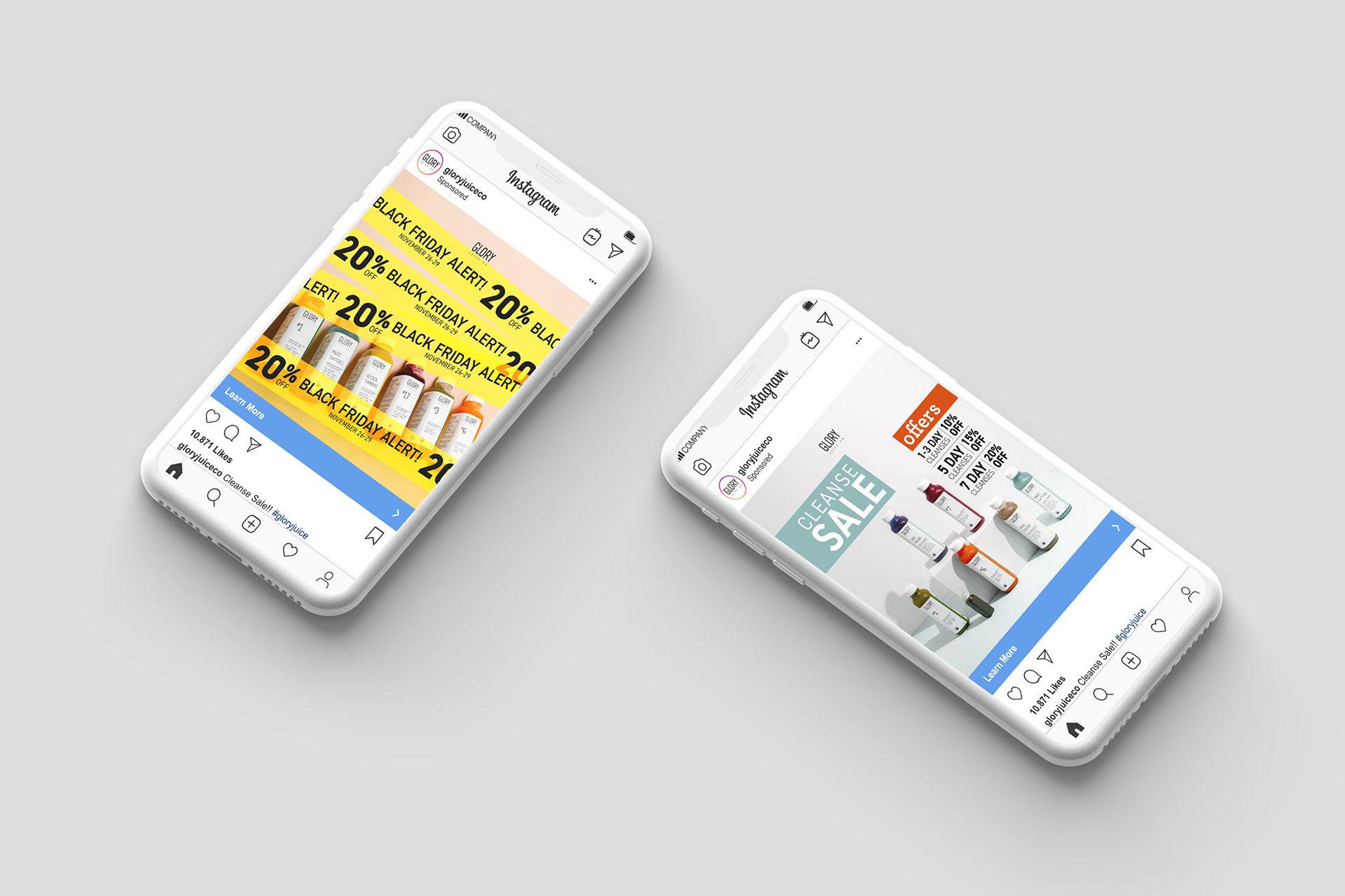 My idea was to create premium, minimalist, and clean designs. The typefaces are elegant and the Archer one adds a pinch of fun and modernity. Muted colours for the backgrounds were chosen to make the Glory's products stand out.